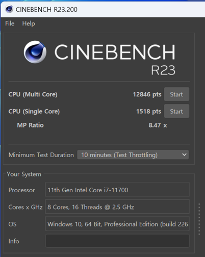 전력 제한 전 시네벤치(멀티) 점수는 12846점이었습니다.