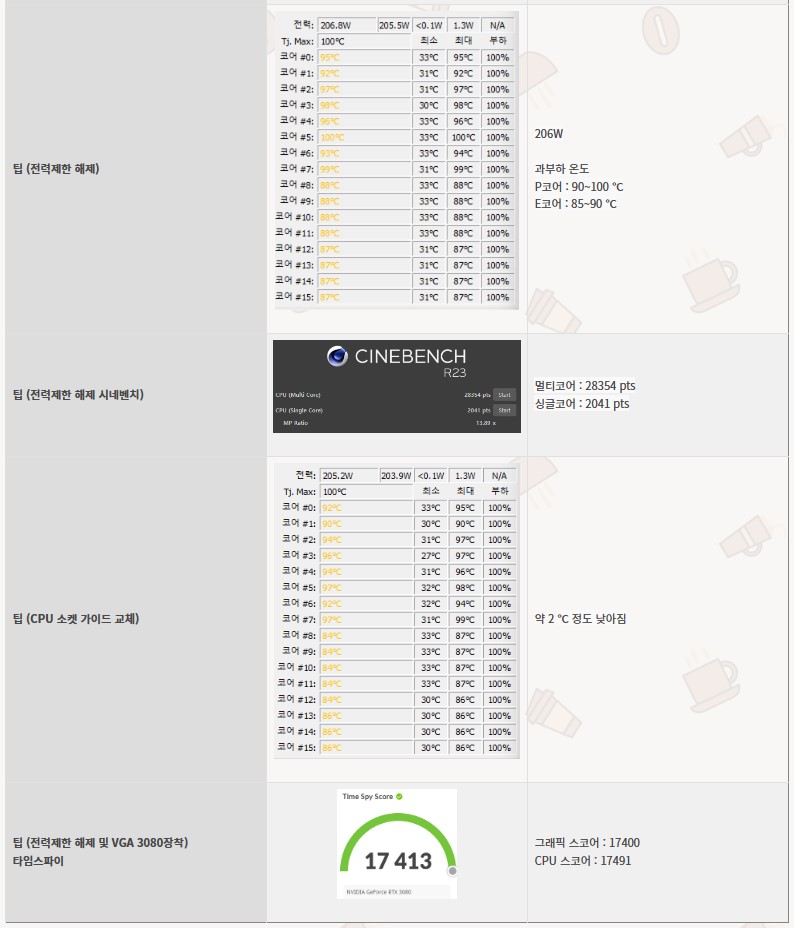 메인보드마다 전력제한이 다르게 적용되어 있습니다. 제가 사용한 MSI보드는 전력제한이 걸려있었는지 해제 전 과부하 테스트에서는 80~90 ℃사이로 온도가 측정된 바와 같이 적당히 갈구는? 것 같습니다. 따라서 추가로 전력제한을 BIOS설정으로 해제하고 test진행한 결과 시네벤치 점수만을 확인하더라도 멀티코어 점수 20302 vs 28354 점수차를 확인하였습니다.