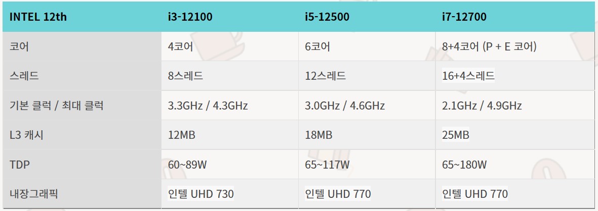 먼저 인텔 12세대(Alder Lake) i3, i5, i7제품의 상세정보표입니다.