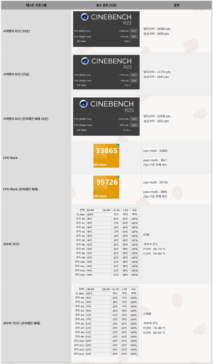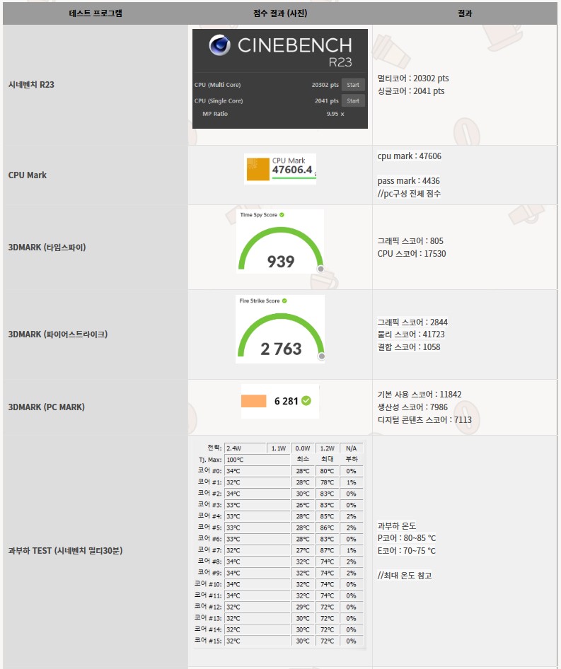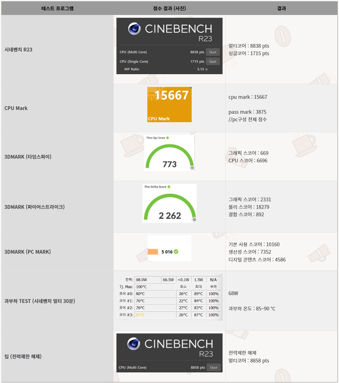 cpu 각각의 결과를 먼저 알려드리고 아랫부분에 취합 내용을 전달드리겠습니다.