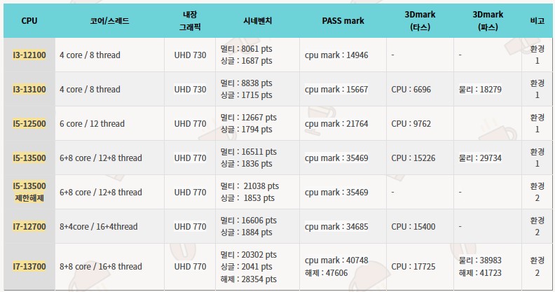 위에서 테스트 진행한 13세대 CPU 3종 (i3-13100, i5-13500, i7-13700)을 12세대 3종 (i3-12100, i5-12500, i7-12700)과 점수 비교를 진행해 보겠습니다.
