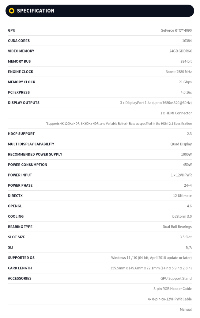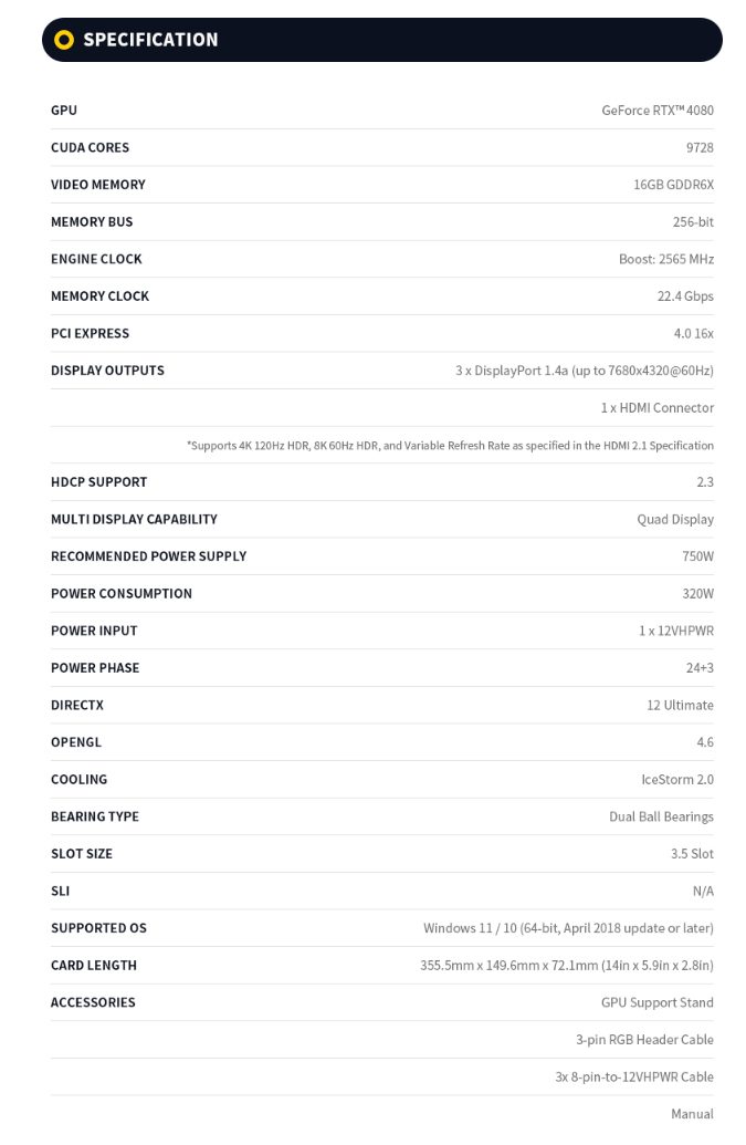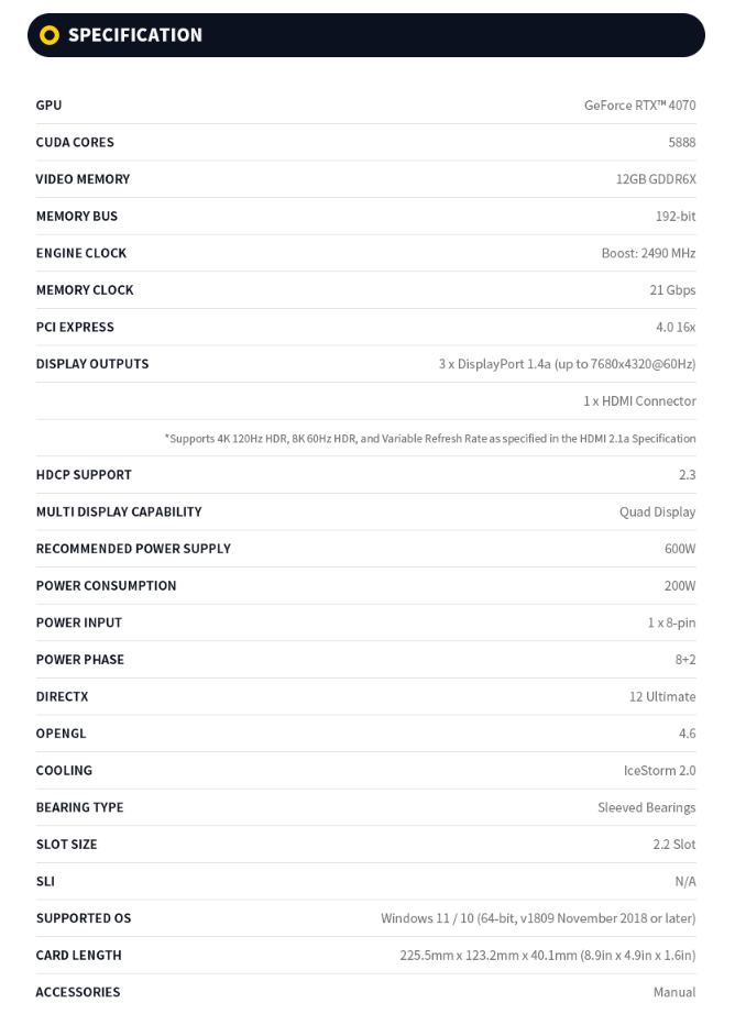 아래 zotac 홈페이지에 공지된 그래픽카드 사양표입니다.