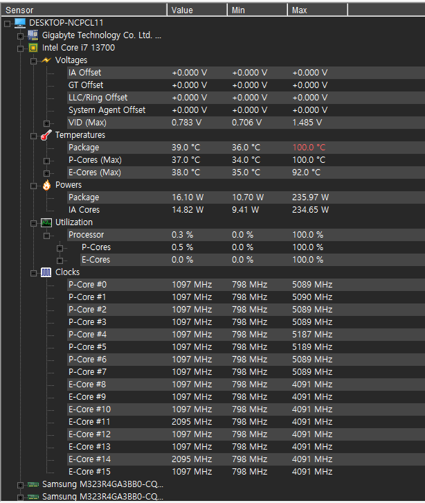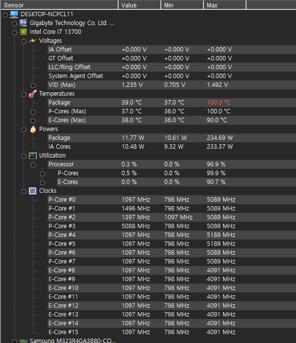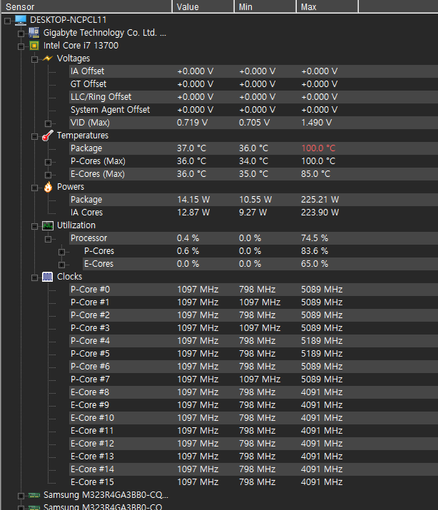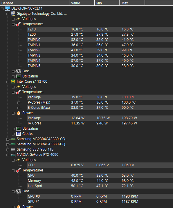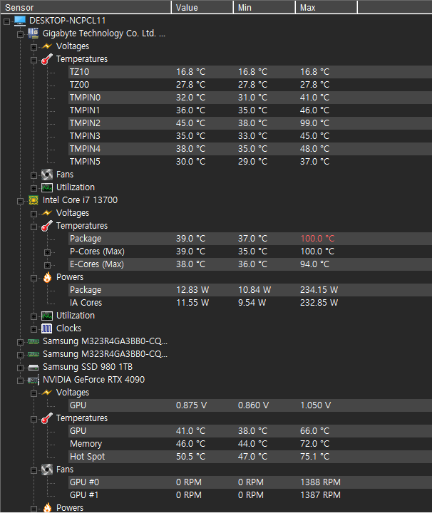 여기에서 다시 한번 느끼는 점은 13세대 cpu의 발열은 엄청납니다. 그냥 마음 편하게 i7급 사양부터는 수랭쿨러를 추천드려요. 순간 피크치값이긴 하지만 100도를 찍었네요.