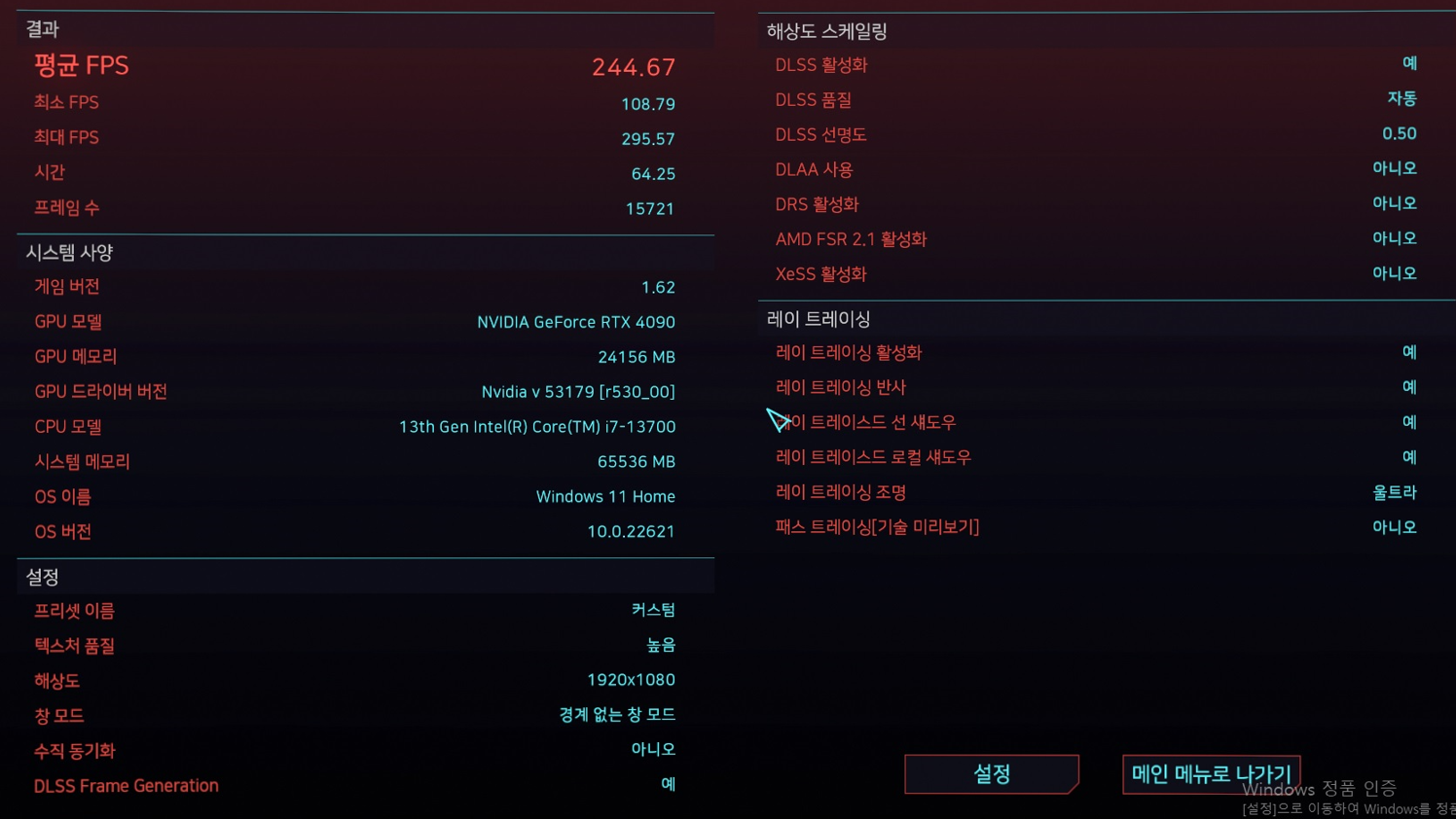 | 4090 | 그래픽점수 : 37,575 | 그래픽점수 : 81,575 | 평균 프레임 : 244.67 FPS | 1% low framerate : 152.8 FPS |
