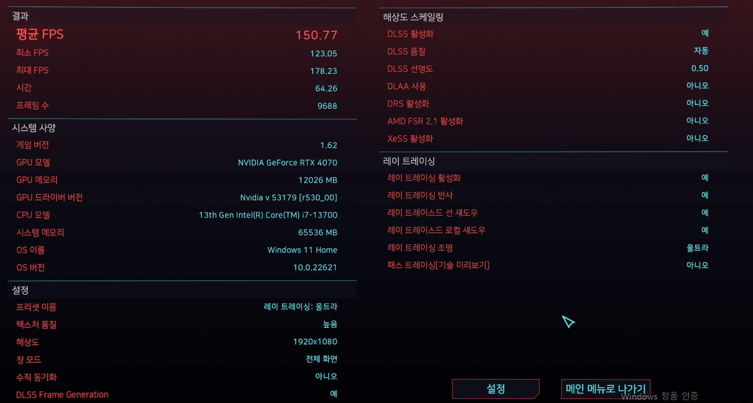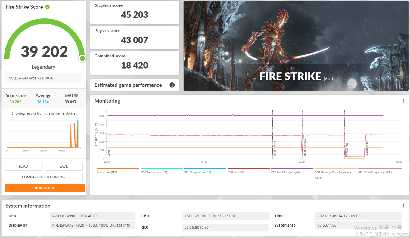 | 4070 | 그래픽점수 : 17,235 | 그래픽점수 : 45,203 | 평균 프레임 : 150.77 FPS | 1% low framerate : 104.1 FPS |