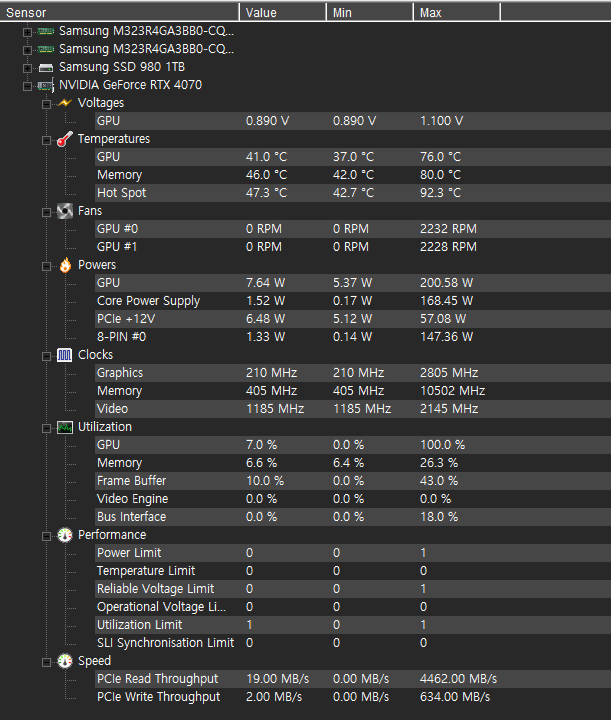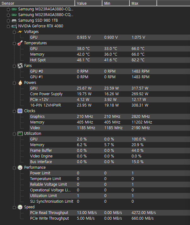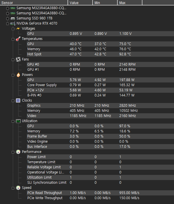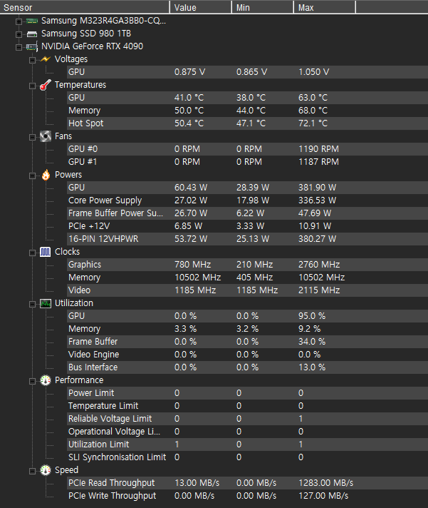 최대 전력 380W, GPU클럭 2760 MHz, 온도는 65~75 정도입니다.