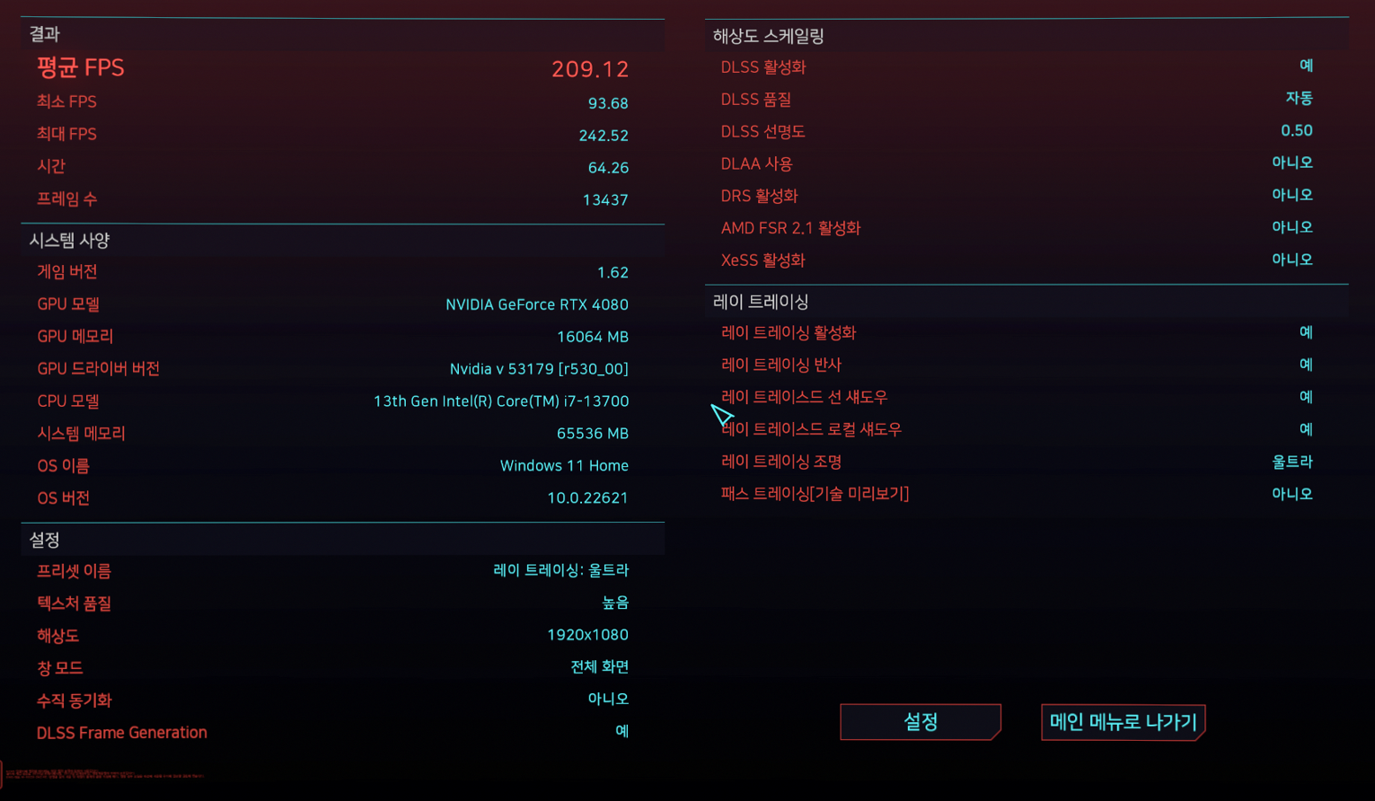 추가로 사이버 펑크 벤치마크 test를 진행하였습니다. DLSS 기능 활성화로 진행하였습니다.
