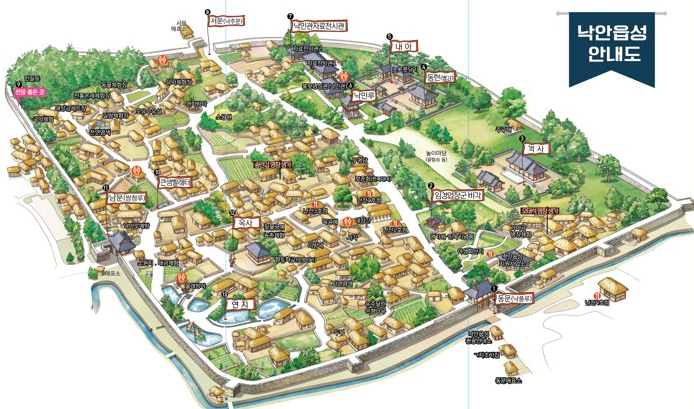 입구 쪽 중앙대로를 기준으로 왼편은 숙소 및 다양한 체험활동(관아체험, 도자기, 새끼줄, 전통혼례 등등)이 가능한 공간, 오른쪽은 관청, 객사, 전시관 등과 같은 시설들이 있습니다.