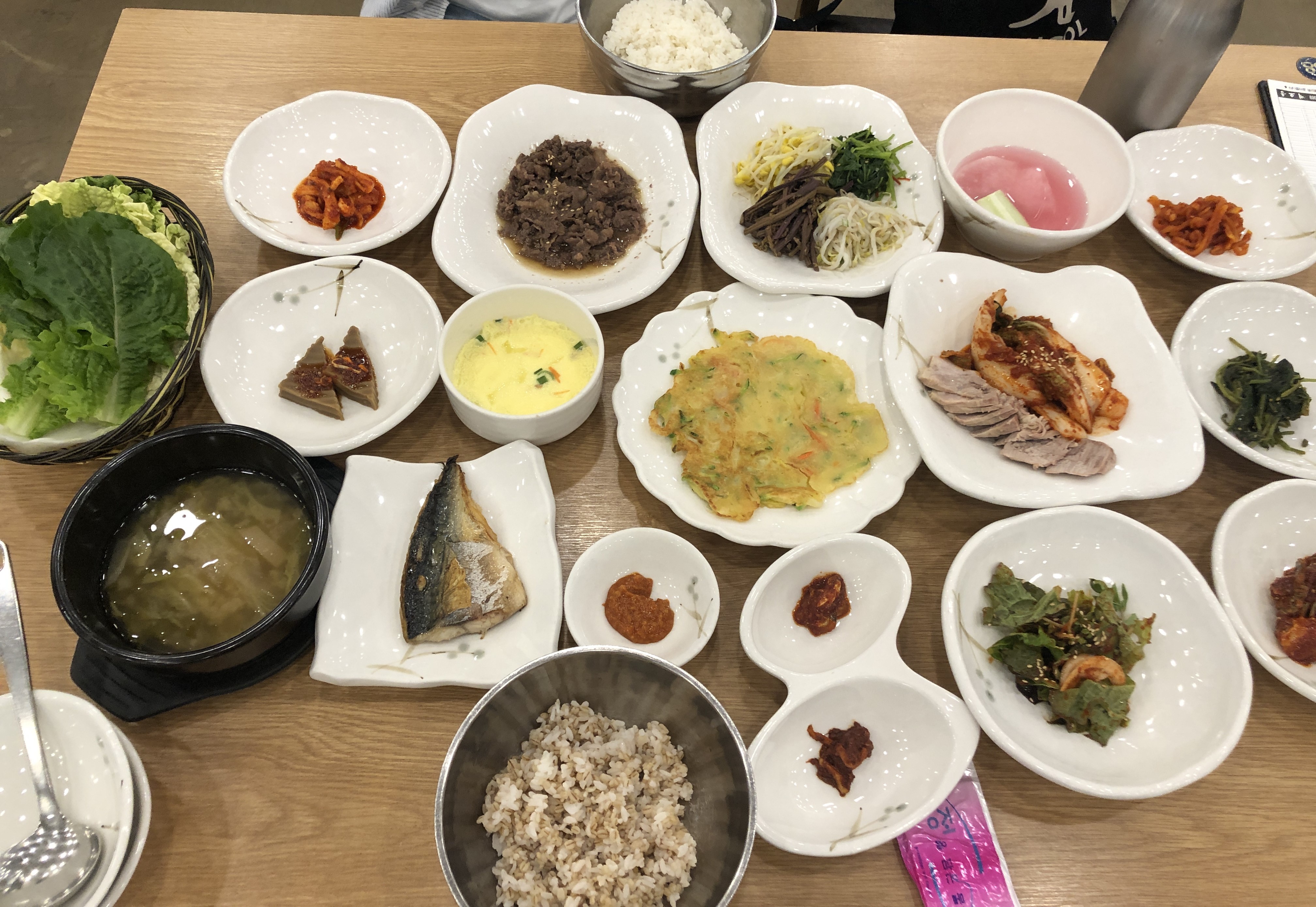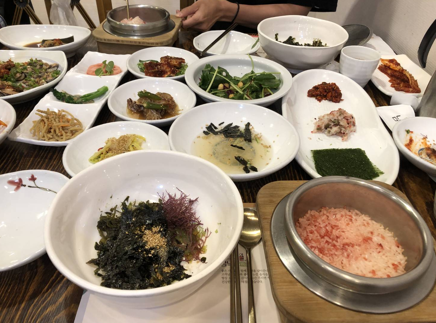 기본반찬 중 김처럼 생긴 거 보이시나요? 감태입니다. 가운데는 찹쌀밥 그 옆은 가오리무침이었나요?