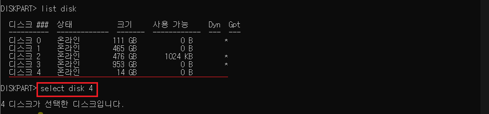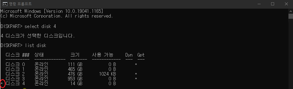 위와 같이 list disk를 다시 한번 입력해보면 선택된 디스크를 확인할 수 있습니다.