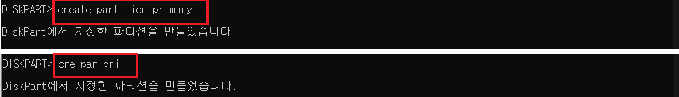 create partition primary 복잡해서 작성이 불편하기 때문에 축약 명령어가 있습니다. [ cre par pri ]