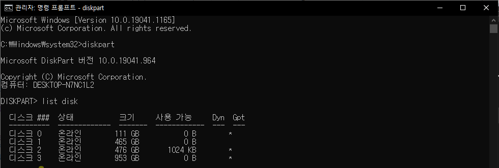 DISKPART> 란 글이 보이시면 정상적으로 실행되셨습니다.