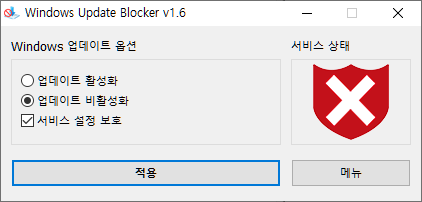방패에 X모양의 창이 나오게 된다면 자동 윈도우 업데이트를 차단해놓은 상태입니다.
